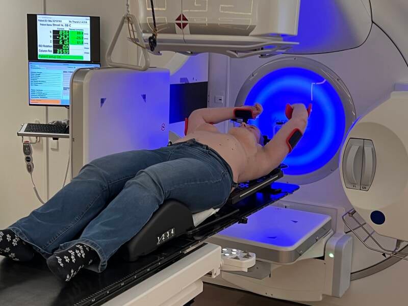 Een week later is het tijd voor mijn eerste bestraling. Net voordat we naar binnen lopen ben ik een beetje zenuwachtig. Ondanks de goede uitleg, weet je toch niet helemaal wat je precies kunt verwachten. Ik was snel aan de beurt. Werd begeleidt naar een kleedkamertje, mocht mijn bovenlijf ontbloten. Daarna werd ik opgehaald. Gelijk rechts uit het kleedkamertje is de controlekamer. Vanuit daar houden ze mij dadelijk in de gaten. We lopen links door een gang die in de bocht naar rechts draait. Daar staat het apparaat. Ik mocht gelijk weer op de tafel gaan liggen. In dezelfde houding als op de CT-scan. Ik word recht gelegd, de lasers gaan aan. Een groene en een rode. Op de millimeter moet ik recht liggen. Dan schuiven ze twee schotten aan weerszijden uit. Die zijn nodig voor de controle scan op dit apparaat. We doen de ademhalingsoefening, met ingehouden adem doen ze een laatste controle. En dan gaan ze weg. Ik moet muisstil blijven liggen. Hmm mijn schoenen irriteren, maar ook die moet ik stil laten liggen. Dan gaan we beginnen; haal adem, blaas uit, haal adem, blaas uit, haal dieper adem en houd vast. Eerst de scan.. poe die duurt lang, stiekem twee teugen extra lucht genomen na 22 seconden. Gelukkig was de scan goed en verschuiven ze mij met tafel en al nog ietsje zodat ik echt recht lig. Daarna begint het echt! Weer de adem inhouden, het apparaat begint te knetteren (alsof je statisch geladen bent) en te zoemen. Dan draait het langzaam om je heen. In mijn geval bestralen ze in 6 delen, zodat ik iedere keer genoeg tijd en rust krijg om mijn adem goed in te houden. De 5 volgende keren telde ik de seconden mee tijdens het adem inhouden. Dat geeft mijn hersenen wat te doen. Maar de daadwerkelijke bestralingen gingen veel sneller. Toen was het alweer klaar. Al met al stond ik na 20 min weer buiten. Alle 14 andere keren gingen ongeveer gelijk aan het zojuist beschreven ritueel.